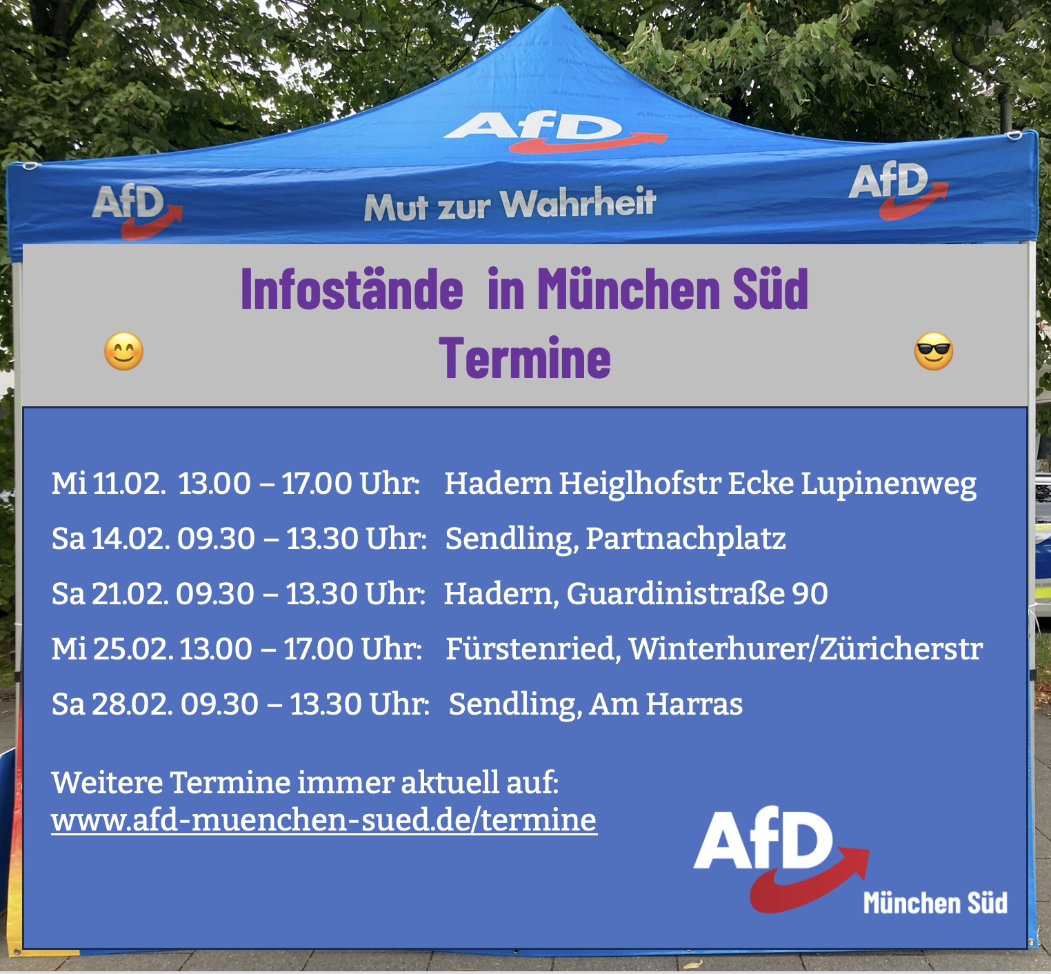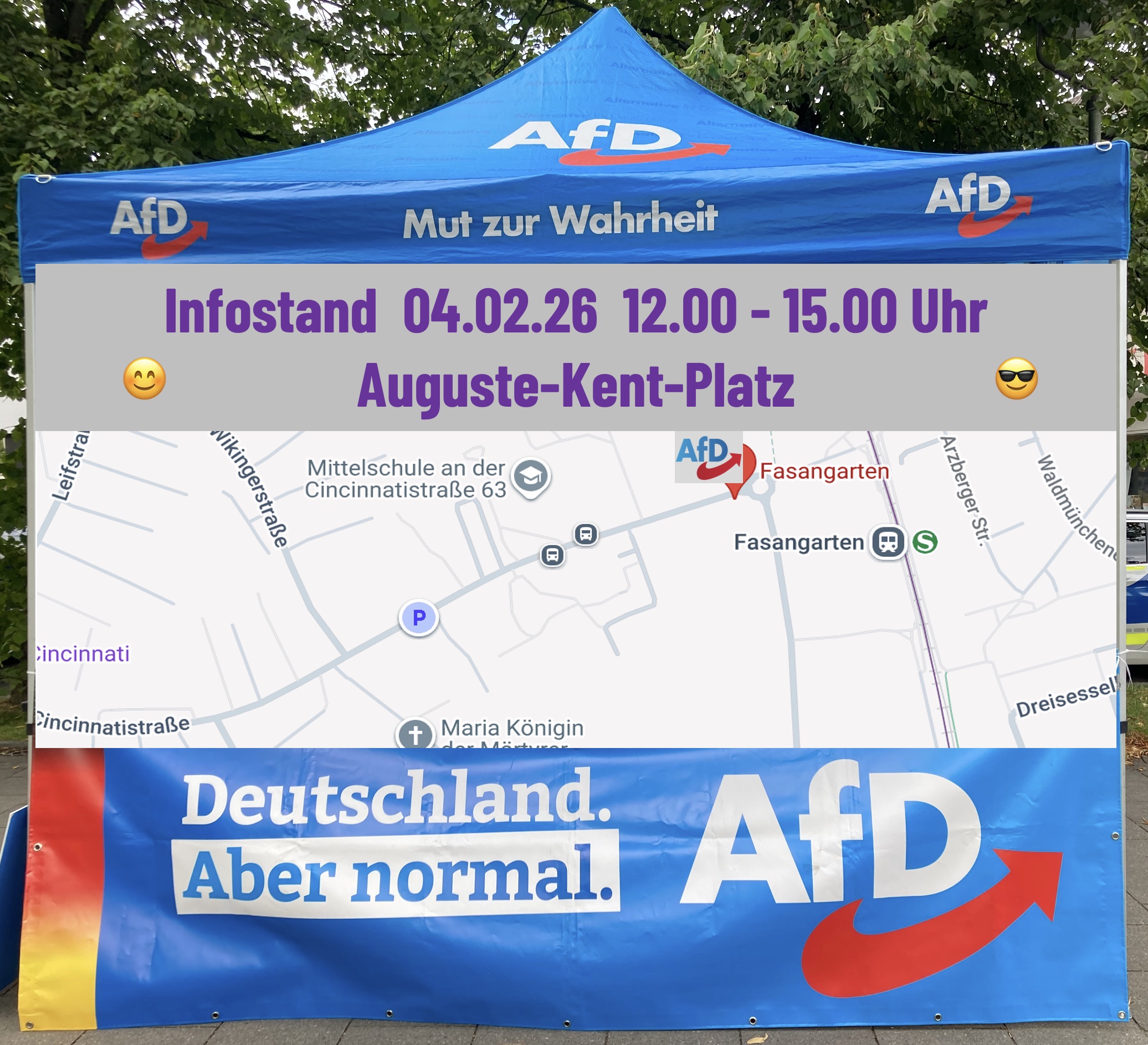 Nachfolgend finden Sie die Termine der nächsten Infostände der AfD im Münchner Westen - immer von 10 Uhr bis ca. 14 Uhr. Wir freuen uns auf Ihren Besuch! Folgende Infostände sind wurden zwischenzeitlich durch das KVR genehmigt: Januar 10. Wotanstr. 1, S-Bahn Laim 17. Willibald Platz v.d, Sparkasse 24. [...]