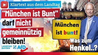 Der Verein München ist Bunt e.V. firmiert als Verein für Toleranz und gegen Rassismus. Das alles deckt sich mit der Agenda der AfD, nur stimmt es halt einfach nicht. Deshalb haben wir am 5.12.22 die Gemeinnützigkeit und damit die steuerliche Absetzbarkeit von Spenden an diesen Verein gegenüber der Finanzbehörde angefochten, sprich zur Überprüfung von Amts wegen angezeigt und dazu unzählige Dokumente vorgelegt, die beweisen, dass dieser Verein sich politisch betätigt und dies vor allem gegen die AfD. Von Toleranz ist da absolut nichts zu spüren, und wer Politiker, die nachgewiesene, unzweifelhaft migrantische Gewalt beklagen, oder in den Parlamenten gegen eine ungezügelte Zuwanderung in die Sozialsysteme eintreten, als Rassisten bezeichnet und glaubt sie deshalb bekämpfen zu dürfen, der darf eben nicht mehr vom Steuerprivileg der Gemeinnützigkeit profitieren. So wie bei Campact e.V. auch schon geschehen, muss dieses Privileg also fallen.