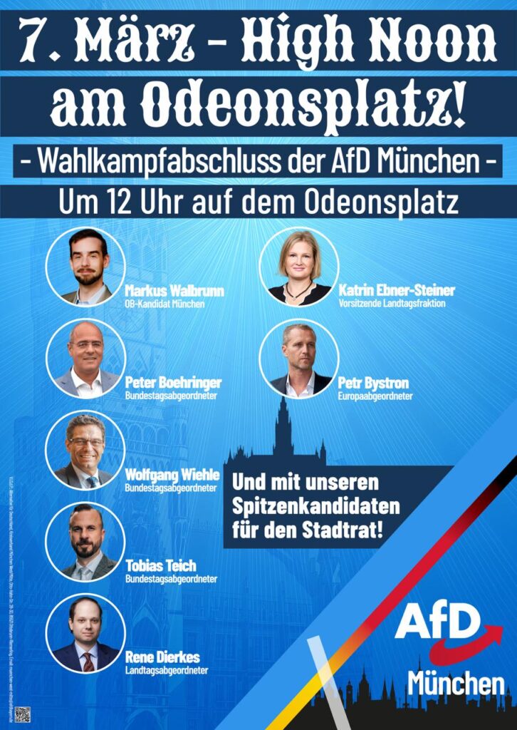 Es werden reden unser Bundestagsabgeordneter Tobias Teich, unser Kreisvorsitzender und Landtagsabgeordneter Rene Dierkes, sowie unsere Stadtratskandidaten Christian Christoph, Manuela Albracht und Dr. Peter Reich; Helmut Strauf als Mitglied vom Bundes- und bayerischen Landesvorstand der Generation Deutschland wird zudem von der neuen Jugendorganisation der AfD berichten.